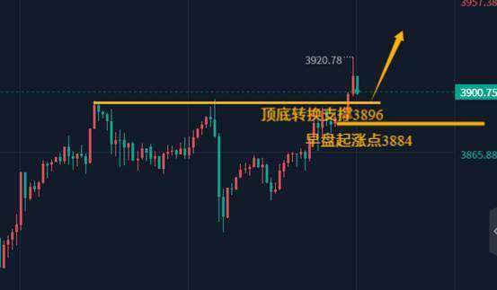 今日周一早盘开盘后,黄金价格果然突破前高3896后放量大涨至3920区域,关键性位置突破形成放量大涨在预期之中,昨日也强调今日早盘突破3896历史高位后去直接跟随做多看涨,当前黄金3896前高已破后形成反向支撑,接下来短期可以参考顶底转换3896附近的支撑,以3884为分水岭继续看涨黄金。