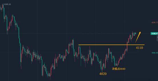 昨日午后黄金在次低点4040做了W底,企稳后上涨,仔细观察这段时间行情,都是做出W底上涨,所以也有强调黄金分水岭已经出现,晚间美盘依托低点防守多,突破4110之后顺势跟进多,隔夜黄金突破4110后如期迎来大涨,并且凌晨盘面价格小幅调整的低点在4113一线,再次回踩确认4110顶底转换支撑位置有效性,那么今日黄金继续关注4110上方逢低做多,黄金多头还有望更上一层楼。