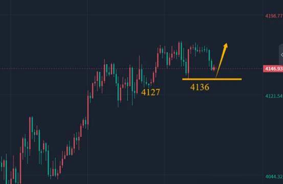 短线上更多的是日内行情卡点操作,行情晃晃悠悠,震荡上升,中途伴随着不断的冲高回落,操作一定要踏准节奏,冲高不追多,靠近日内的起涨点再去做多,这一点我们也明确提示了,晚间依托4027/29分水岭防守回踩多,实际盘面价格回踩至4136后止步上涨。