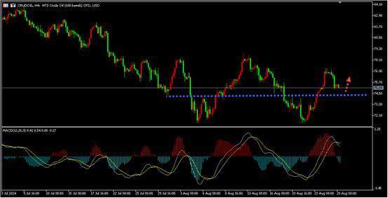 周二原油价格因市场担心美国和亚洲大国经济增长放缓可能会减少对能源的需求,也有部分多头获利了结,尤其是油价在前三天暴涨逾7%之后。油价略微回调。后市投资者关注下方4小时支撑区域,调整企稳后做多原油。同时投资者应密切关注即将发布的美国EIA原油库存数据以及地缘政治局势的变化,特别是中东和乌克兰的动态。这些因素将直接影响原油市场的供需平衡和价格走势。