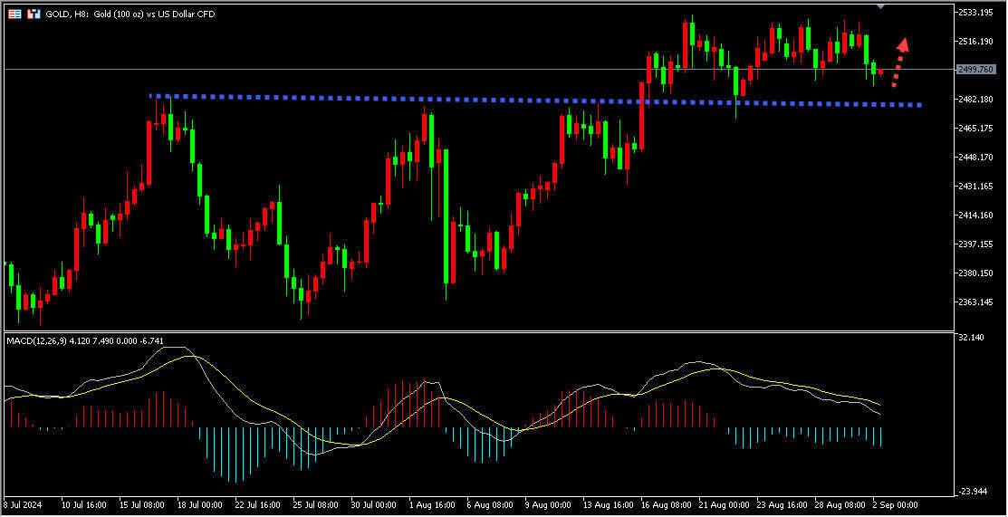 黄金价格周五在美国通胀数据符合预期后美元和美债收益率走强等影响下,金价盘中一度跌至2494.12美元/盎司,但由于美联储9月降息的可能性仍然存在,黄金仍录得月线涨幅。今日黄金继续关注下方4小时支撑区域2480。