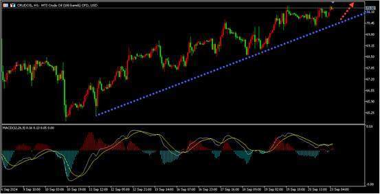 两大原油油价上周均上涨超过4%,实现了周线两连阳,这得益于美国降息和美国供应下降。今日短线原油关注下方1小时上升趋势线的支撑区域,油价短线回调企稳后,继续做多原油。同时投资者需要关注本周美国等西方国家的制造业PMI数据,这个数据将揭示通胀和经济最新动态,对油价产生重要影响。
