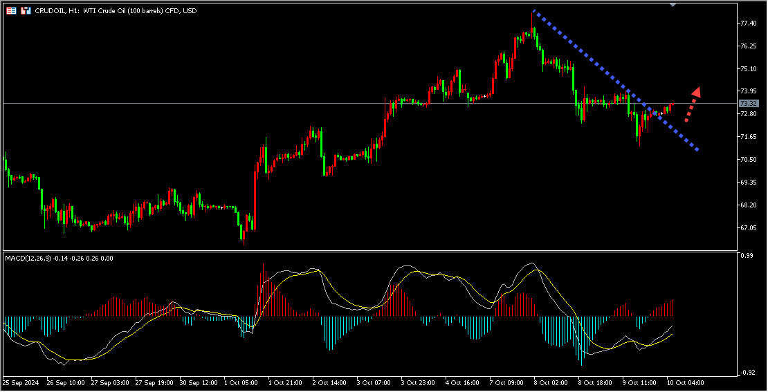 此前数据显示美国原油库存上升,油价周三盘中一度下跌近3%,但中东冲突导致伊朗供应受扰的风险和美国遭遇飓风米尔顿限制了跌幅。目前原油价格上涨突破了1小时下跌趋势线压力区域,今日短线关注下方1小时下跌趋势线突破以后形成的支撑区域,调整企稳后短线做多原油。