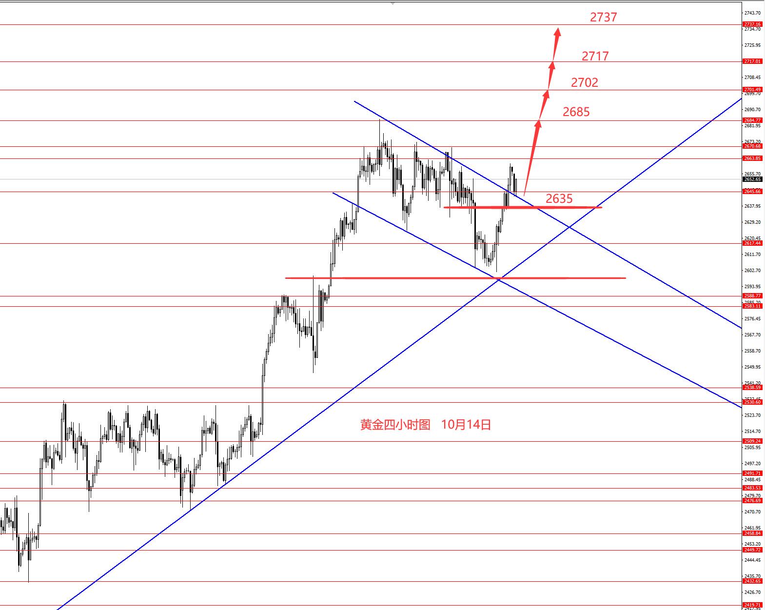 黄金上周还是下探了通道下轨,最低2605区域。从图形来看,上周下探完,并且向上破了通道上轨,所以本周延用上周框架思路,继续做多黄金。本周初关注下方2635一线强支撑,再关注2624,2624以上小波段继续看涨黄金,目标仍是新高2702和2717和2737附近,只是今天进场止损点不太好摆放,左策止损要摆在2624以下才可以有点大,所以建议本周盘整区域结束后找小级别信号进场,到时止损可以摆放的小一点。框架思路仅供参考,风险自负。