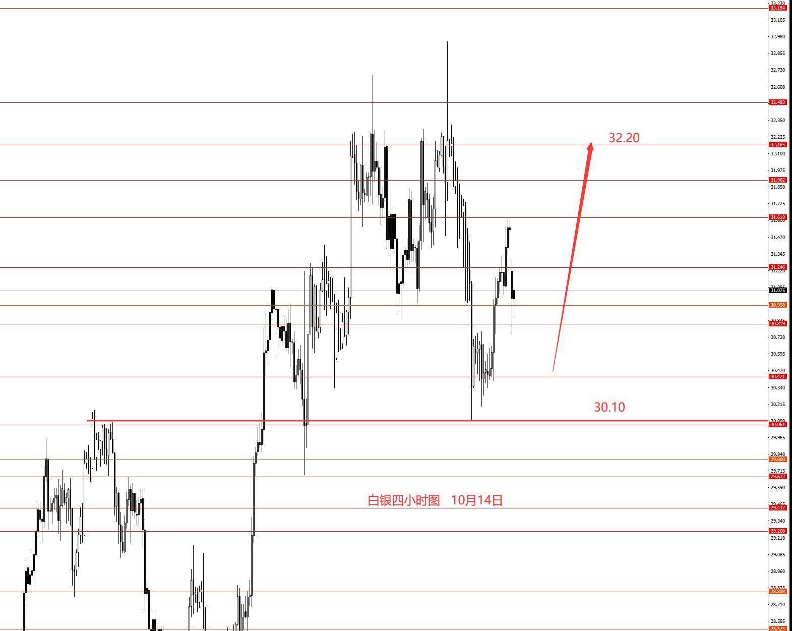 白银本周思路同黄金一样,下方重点关注上周低点30.10区域,以上偏向于做多,上方关注32.20和32.50强阻力区域,中长线白银也是涨势,按震荡上行格局操作。今日白银只有思路,没有具体操作建议。