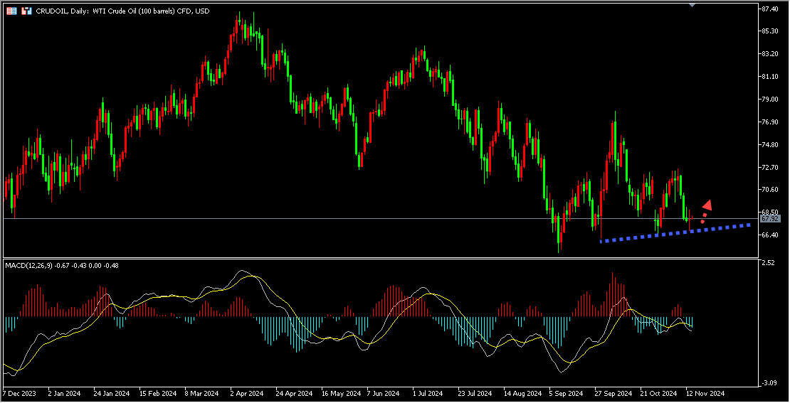 OPEC(石油输出国组织)预计全球石油产量将增加,而需求增长则显得乏力。这一预期在一定程度上限制了油价的反弹幅度。美元走强使得以美元计价的石油对其他货币持有者来说变得更加昂贵,这可能进一步抑制需求。尽管如此,美原油的日线图并未跌破关键支撑位,因此市场参与者仍需关注即将发布的EIA(美国能源信息署)库存数据,以评估短期内油价的情绪变化。