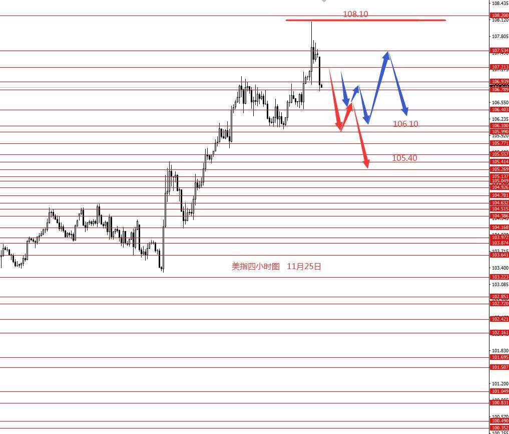 美指上周正如预期冲高至108.10附近周图收中阳柱。从图形来看,本月美指的涨幅已到头,本周美指在高位震荡或小幅震荡下行的概率较大些,上方关注108.20,下方先关注106.10,若下破再关注105.70和105.40.今日早盘已直接回调,目前没好的操作建议可以给大家,只有框架思路,仅做参考吧。