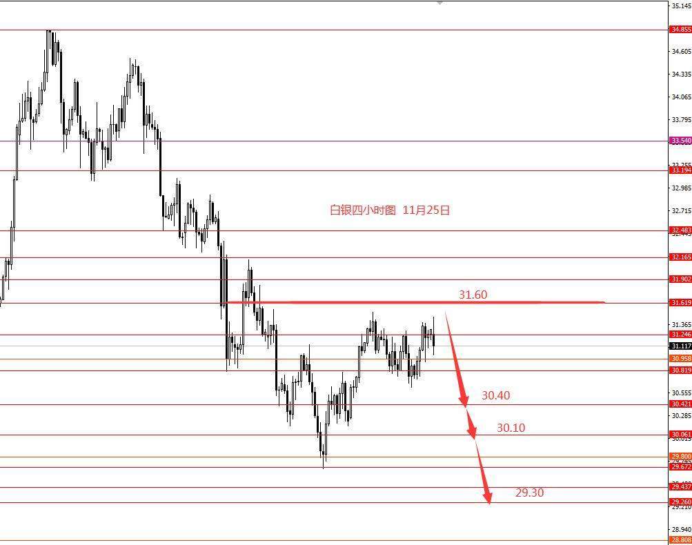 上周白银小幅区间震荡,黄金涨了那么多白银却波幅很小,本周做空白银。周初先关注上方31.60强阻力,以下偏向于看空。操作建议:31.30附近做空,止损31.80,目标看向30.40,再看向30.10和29.60和29.30附近。控制仓量严格止损。