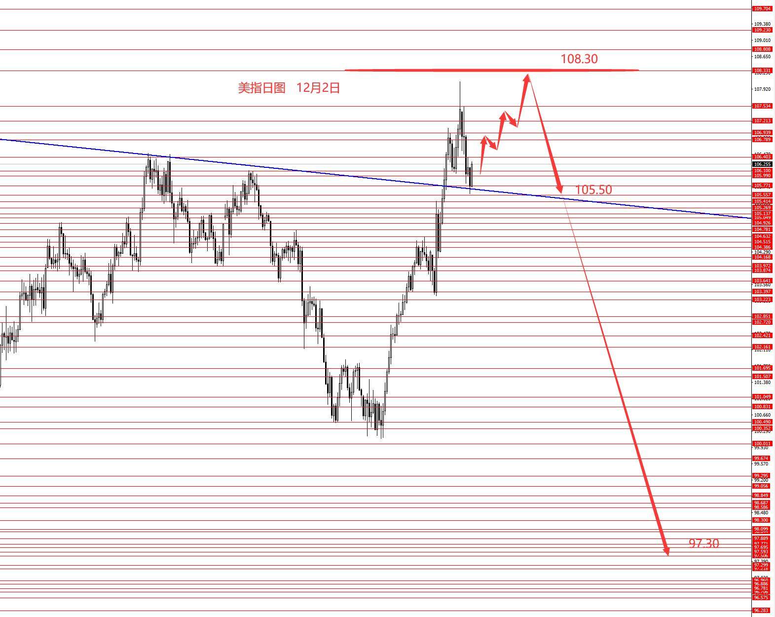 美指上周正如预期向下回调,且周图收阴柱。从图形来看,美指本周二次探顶的概率较大些,本周关注下方105.50区域强支撑,以上向上反弹的概率较大些,上方继续关注107.40和108.30强阻力,二次探顶后波段可以选择高空。今日短线操作建议:106.10附近做多,止损105.40,目标看向106.90和107.40和108.30。上方再关注107.40和108.30强阻力区域的转向信号,出现后再择机逢高做空美指。控制仓量,严格止损。