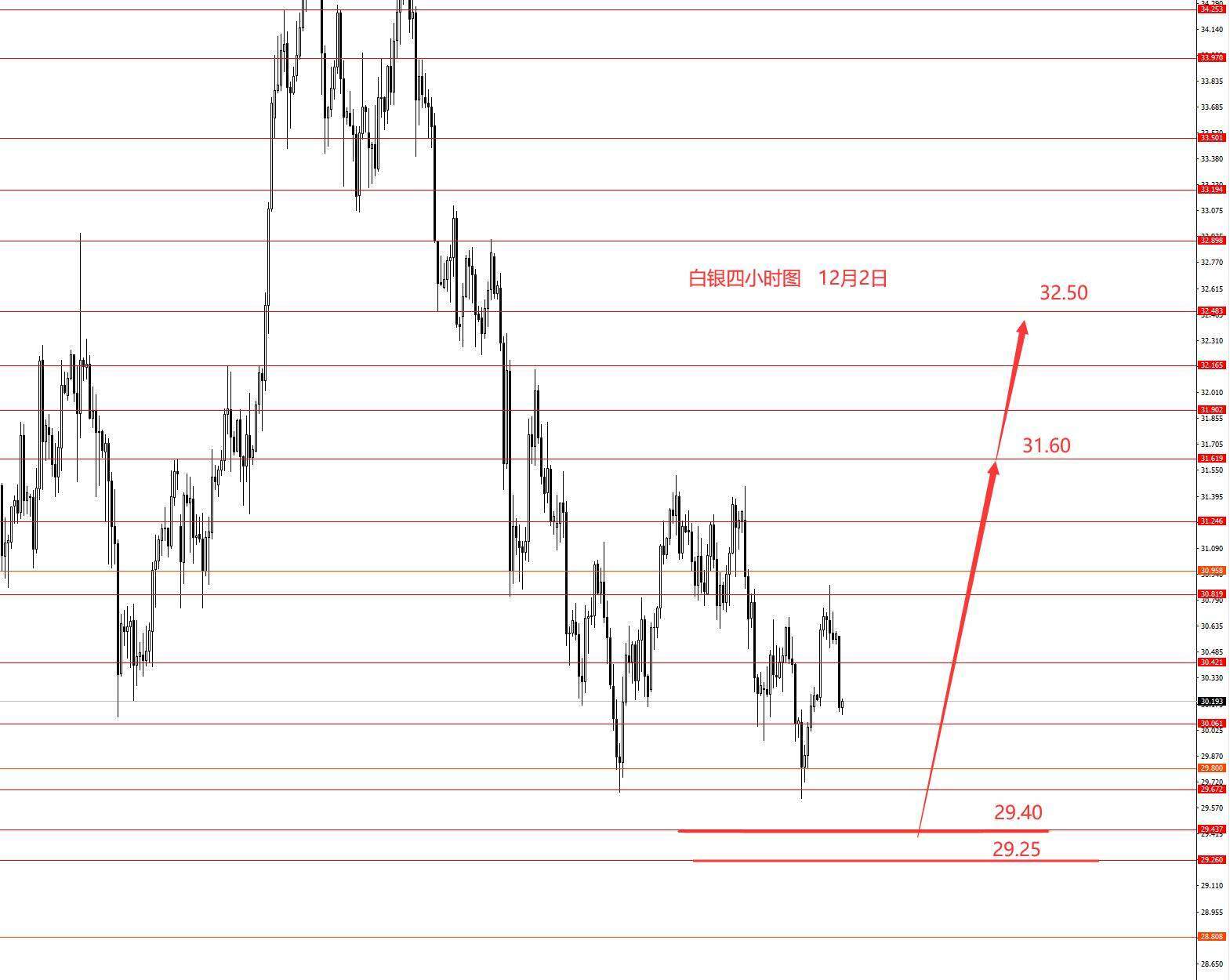 白银上周正如预期向下运行,最低29.60得以支撑周图收阴柱。从图形来看,白银本月大概率向上反弹,月初先向上测试前期低点的概率较大些,甚至创新低,下方重点关注29.40区域强支撑。白银月初不建议做多,因下方空间不大,可等待底部企稳后再去做多比较理想些,上方关注31.60和32.50区域强阻力。今日白银只有框架思路,没有具体操作建议。