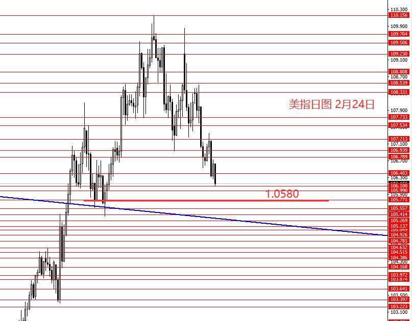 上周美指正如预期反弹后继续下行,目标价106.10也已到位。从图形来看,若此区域继续下行,最多也就是105.80附近,也就是本月的鱼尾行情了,所以建议美指空单可以平仓离场了,剩下的行情观望就好。本周最大概率就是105.80上方震荡盘整为主,可操作性不强,短线可以灵活处理,周内没有小波段行情了,观望为主吧,等待月线收盘后再进行下一步计划。