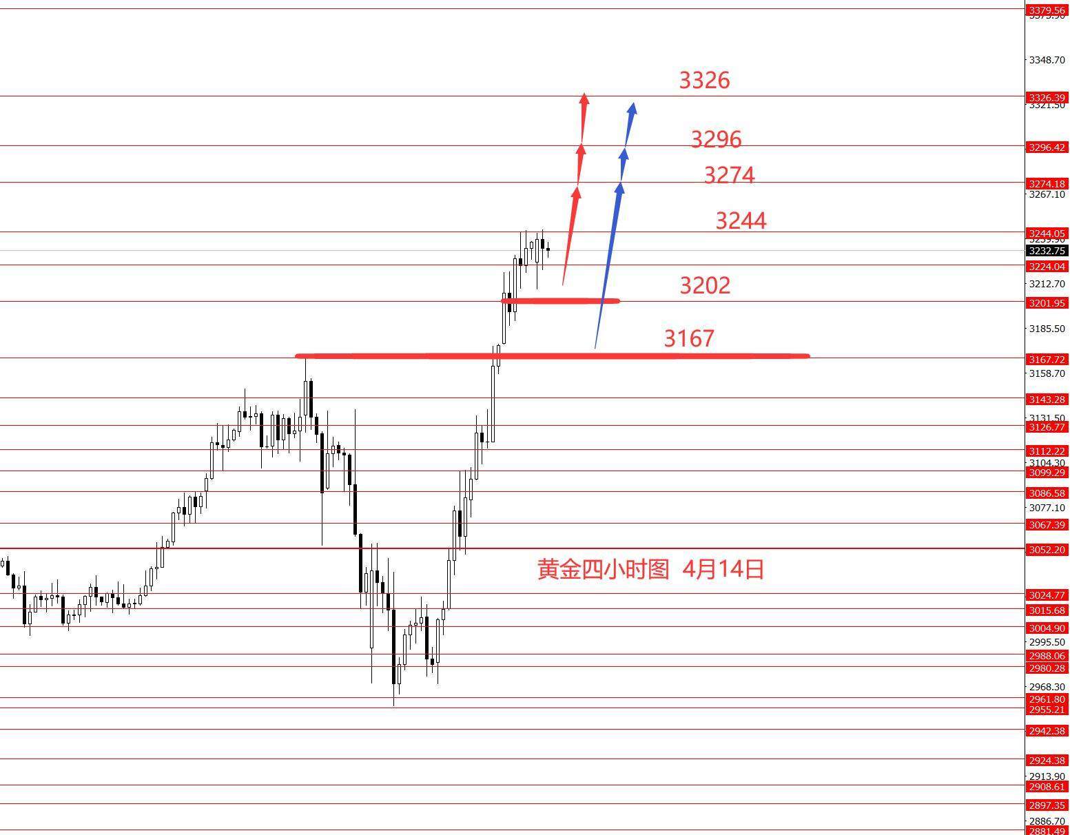 黄金上周是历史以来,周内涨幅最大的一周,周内涨幅近3000点。从图形来看,3167继续看涨,目前还是看涨趋势,但四小时级别需要修整,所以今日上方关注3244强阻力吧,先留意回调修整行情,下方关注3202和3167强支撑。今日没有具体操作建议,建议灵活处理吧,不要轻意去做空单。上方阻力3244和3274,再上方3296和3326和3380.