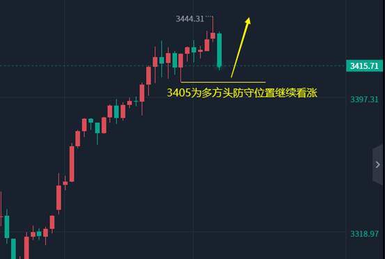 今日早盘价格回撤止步3411一线,隔夜回撤低点在3405一线,守住3405起涨点继续多,以3405为多头防守位置直接多即可,目前黄金报价3415,现价黄金3415直接多,防守3405,目标看向3440。