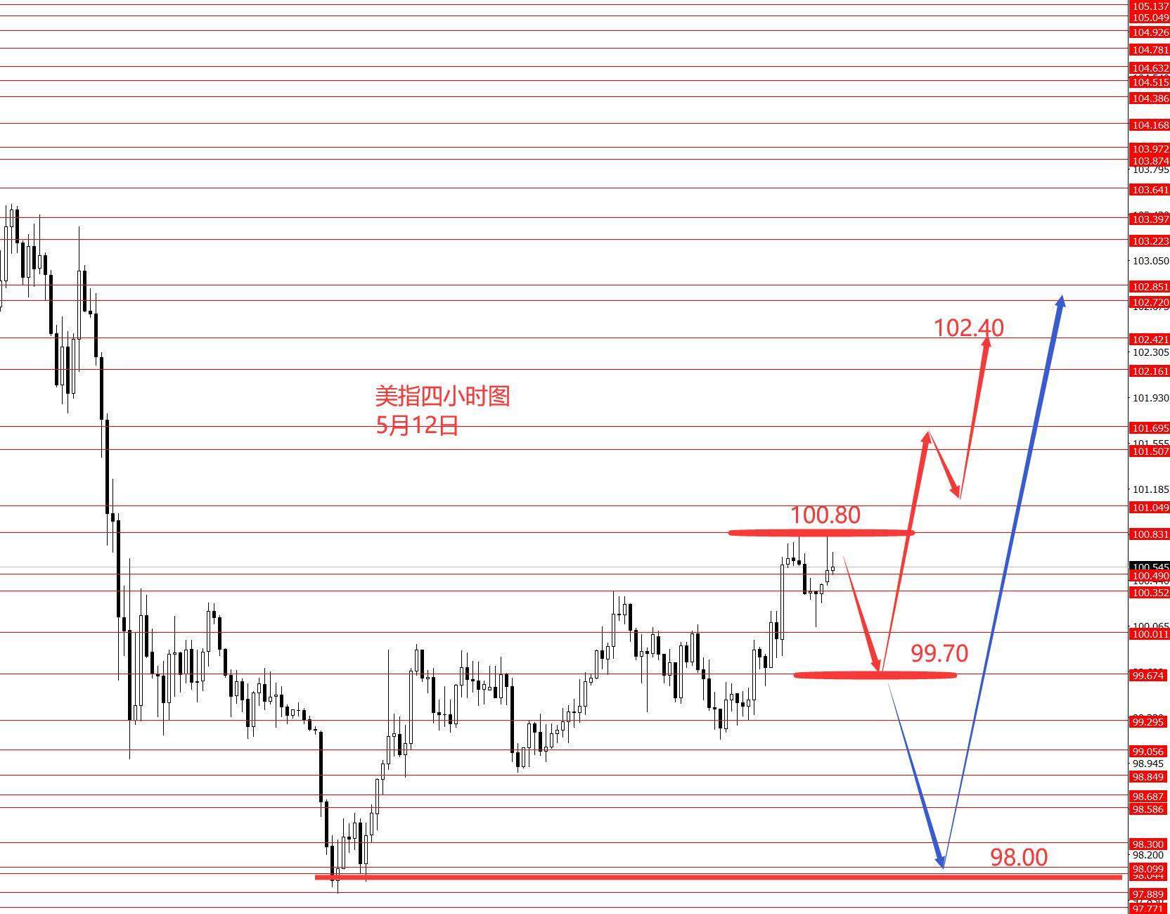 上周美指正如预期向上运行,周图收阳柱。从图形来看,美指修整行情还未结束,这个区域震荡时间大概需要2-3个月,区间为97.30-103.20区间,所以近期就不要去想大行情,都是以震荡短线为主。本周初重点关注上方100.80区域强阻力,留意承压向下短线修正行情,后市是继续回踩99.70震荡上行,还是会深度二次探底,目前不确定。今日周一先观望,然后再走一步看一步吧。分析图仅供参考风险自负。