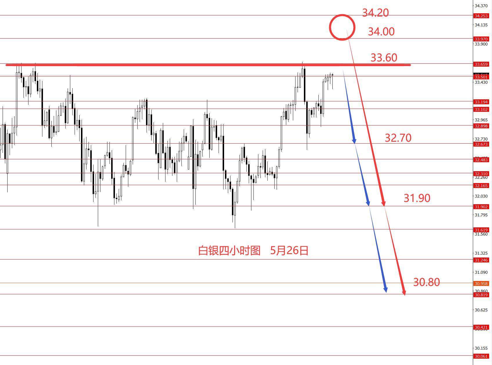 白银上周正如预期向上运行,并上破楔形上轨,最高33.60区域。从图形来看,框架思路仍然要延用上周一框架思路,反市白银建议高空为主,抓34.20-30.80的下跌波段,至于本周最高是否能给到34.20区域不确定,总之放弃多头,建议高空为主。可以等待右侧向下信号明朗后再进场做空,具体看信号吧。框架思路仅供参考,风险自负。