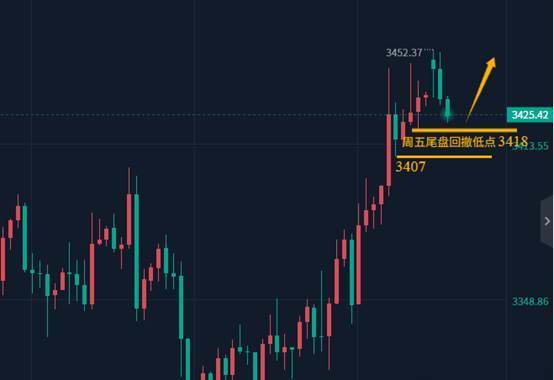 今日早间开盘上涨刷新上周五高点3444至3450上方承压回落,早间冲高不追,留意午后的回撤幅度,上周五尾盘回撤低点在3418附近,其次就是3407强支撑区域,周初只要不破3418就是绝对的强势状态,当前黄金报价3425,以防踏空建议围绕3418支撑直接布局多。