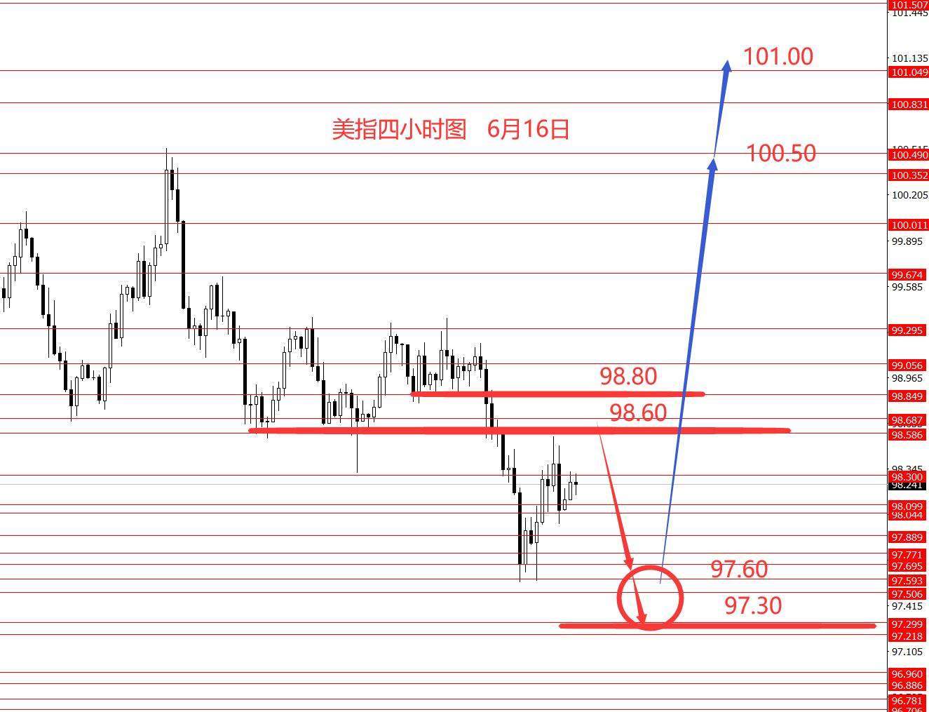 上周美指实际走势跌破98.30,上周分析错误。从图形来看,美指继续下跌并创新低,本周上方重点关注98.80区域强阻力,以下还是偏空头,但也要留意转向行情的出现,因为节奏分析,97.30没跌破前,波段仍然偏向于看涨,故本周操作思路:谨慎做空或观望不操作。周初先关注98.60和98.80一线强阻力。框架思路仅供参考,风险自负。