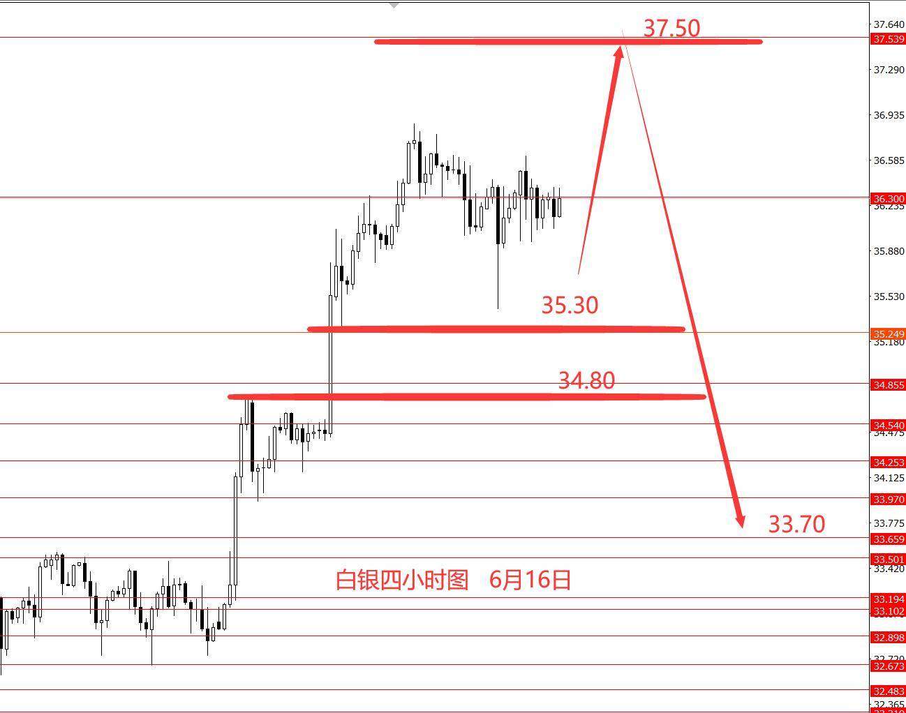 白银上周继续高位震荡,没涨也没跌。从图形来看,白银仍在高位震荡,整体趋势偏多头,下方关注34.80强支撑,上方关注37.50强阻力,本周建议按高位震荡偏多头操作,但也要留意创新高后的反转行情出现。框架思路仅供参考,风险自负。