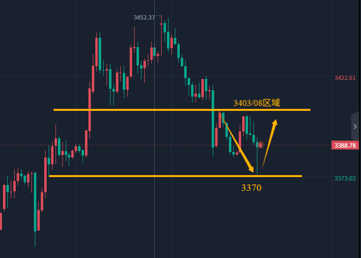 前期金价下探的低点在3408/03区域,跌破这里也就意味着加速下滑,当前行情跌破3403/08区域后转为顶底转换位,这里势必会对金价的反弹产生一定的压制效果,日内可以参考3403/08区域空,下方关注此前的起涨点3370区域,守住这里参与短多,日内的震荡幅度预计不会很大,短线有15美金以上的利润就可以先获利出局!