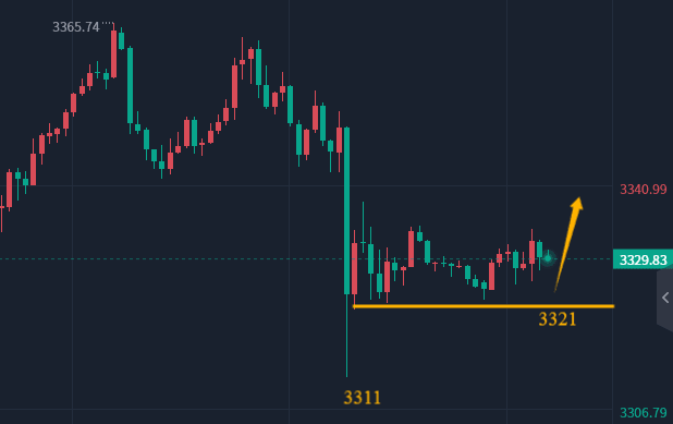 昨晚金价快速下探3311回升,二次回踩的低点在3321,这就是日内的入场点和防守点,今日思路基本和昨晚的思路一样,亚盘可以等待金价回踩3322附近抄底做多看反弹力度,1小时大阴顶点3352,关注这里阻力以下受阻情况,届时考虑短空。具体操作参考黄金3322多,防守3311,目标3338/50;突破3338后可以回踩以3321为止损点3323-30区域均可跟进多。