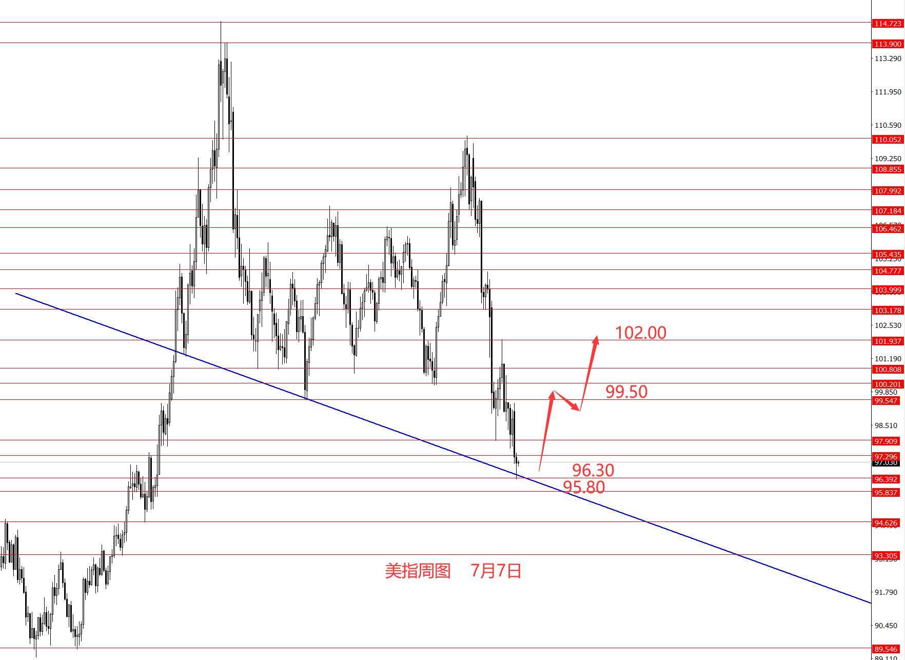美指6.23分析错误,美指99.30承压继续向下运行,最低96.30.从图形来看,美指已到达周线级别强支撑,这波从110趺下来的长线波段行情已到达极限,后市倾向于逢低做多美指,中线向上反弹修整的概率较大,虽然上次博底失败,但中长线分析,后市美指向上测试102的概率相对较大。目前美指日线级别底部还没出来,四小时级别给的反弹信号,是否能小级别带动大级别,还有待确认。今日建议观望,等待日线级别转势信号出现后再进场做多。