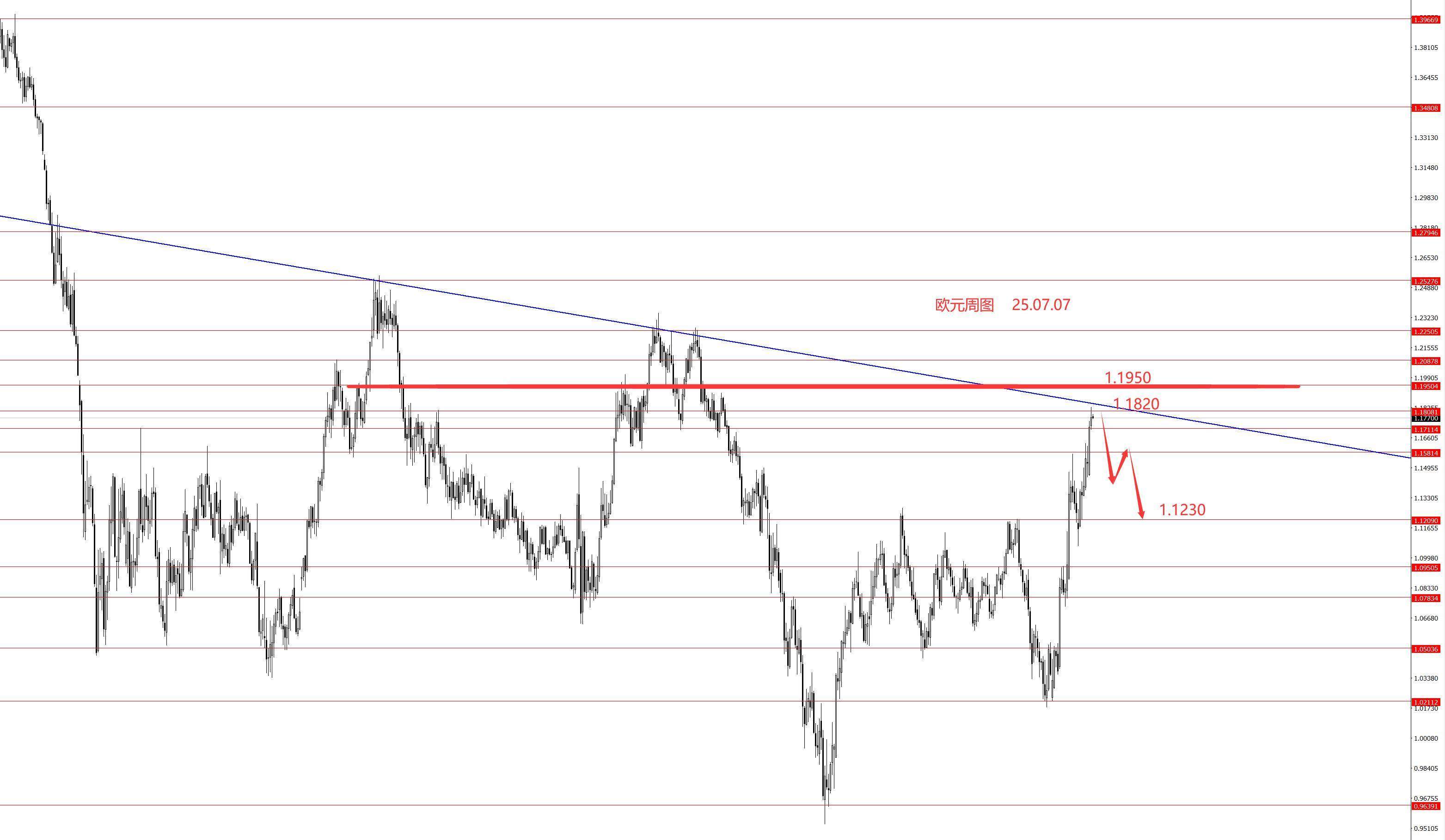 欧元六月末博反转下行失败,6月23号分析错误。从图形来看,中长线波段从1.0200上来这波也到达了上涨极限,后市波段行情建议逢高做空为主,波段目标1.1230附近。四小时级别目前小回调信号出现,是否能带动日图反转,还有待确认。日图和周图目前还没有大幅下跌信号,所以也有可能再创新高。建议继续观望观望,日线级别出现反转信号再进场做空也来得及。