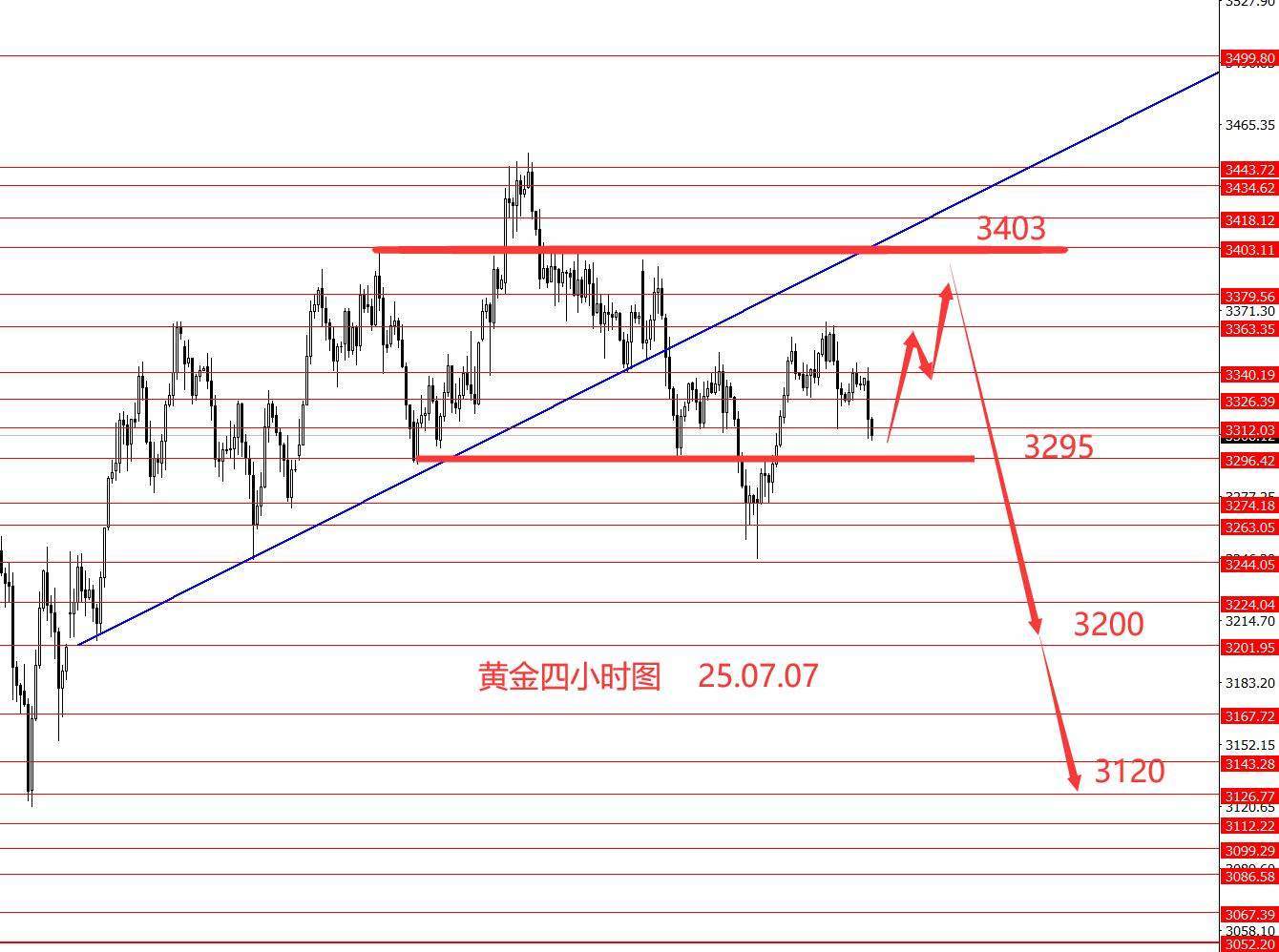 黄金6.23日分析正如预期继续下行,最低跌至3248附近。从日线级别来看,黄金仍然在高位宽幅震荡,符合近两个月大框架分析,本周后市建议按高位震荡偏空头操作,上方重点关注3403一线强阻力,以下还是波段性看空,目标3200和3120区域。本周初重点关注下方3295附近强支撑,以上留意二次向上拉涨行情出现,拉涨后再逢高做空是最理想的走势,备选方案是直接跌破3295区域后,继续下行。目前红线概率相对较大些,今日只有框架思路,没有具体操作建议。