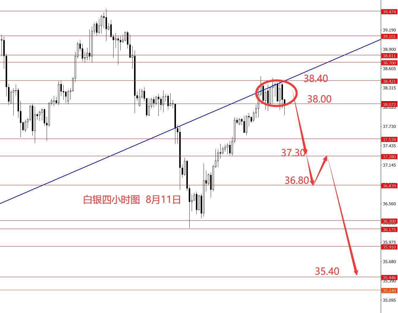 白银上周正如预期向上运行,且按策略空单已进场,本周策略照旧。白银高空策略:38.00-38.40区域做空,止损38.80,目标看向37.30,成功跌破后看向36.80和35.40区域。控制仓量,严格止损。