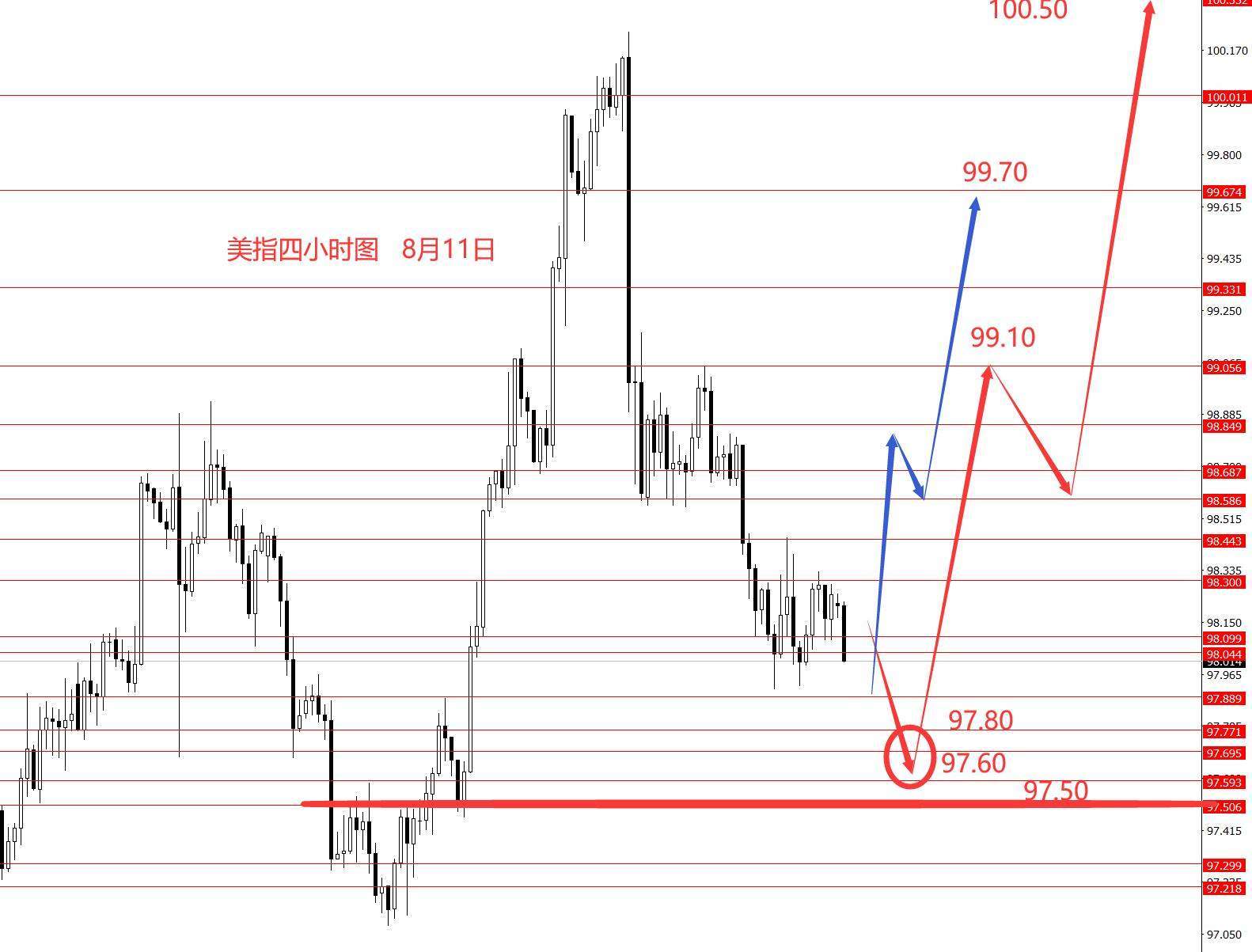 美指上周正如预期向下跌至98.10,收盘偏低,周图收小阴柱。从图形来看,本周美指再创本月新低的概率相对较大些,下方重点关注97.80和97.60强支撑区域,然后留意反转行情出现,等待企稳后再进场做多美指。备选方案就是本周不创新低直接拉涨向上反弹,并向上创新高。建议可等待周一收盘后,行情会相对明朗些,再去进场择机做多,上方关注98.60和99.10和99.30,上破99.70后再看向更高。若成功跌破97.60后得重新分析框架。本周思路仅供参考,风险自负。