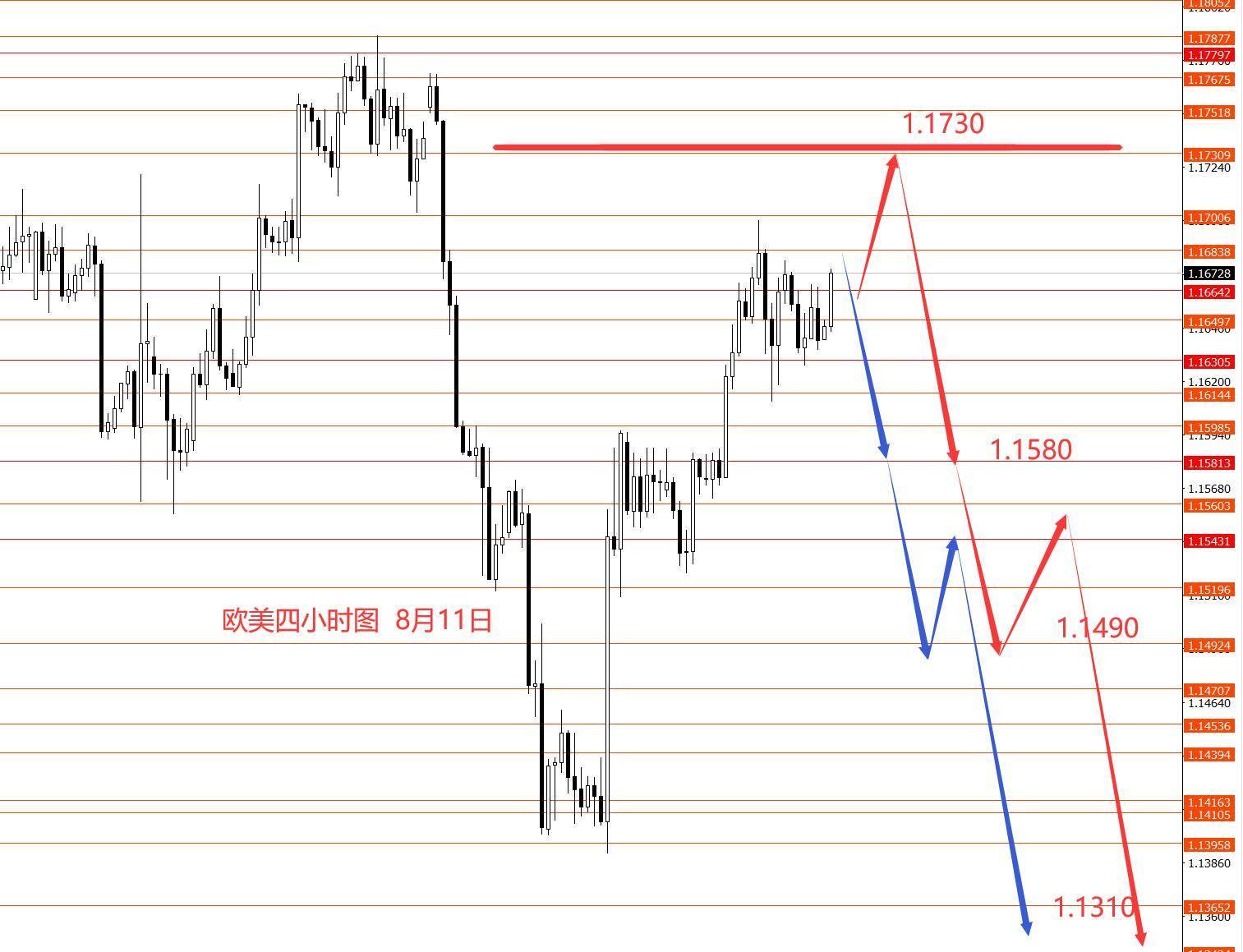 欧元上周正如预期反弹至1.160区域,周图收小阳柱。从图形来看,上周收盘偏高,但节奏没走坏,整体在1.1680多空分界线以下承压受阻。本周继续关注1.1680-1.1700区域一线强阻力,承压后再择机做空。若继续向上破位,留意1.1730强阻力,一样等待明朗的向下信号出现后,再择机高空欧元,下个波段仍然偏向于看空至1.1230和1.0950区域,现在的问题就是高点是1.1680一线,还是要测 试1.1730一线强阻力。建议在这个框架下,选择右侧高空去交易。框架思路仅供参考,风险自负。