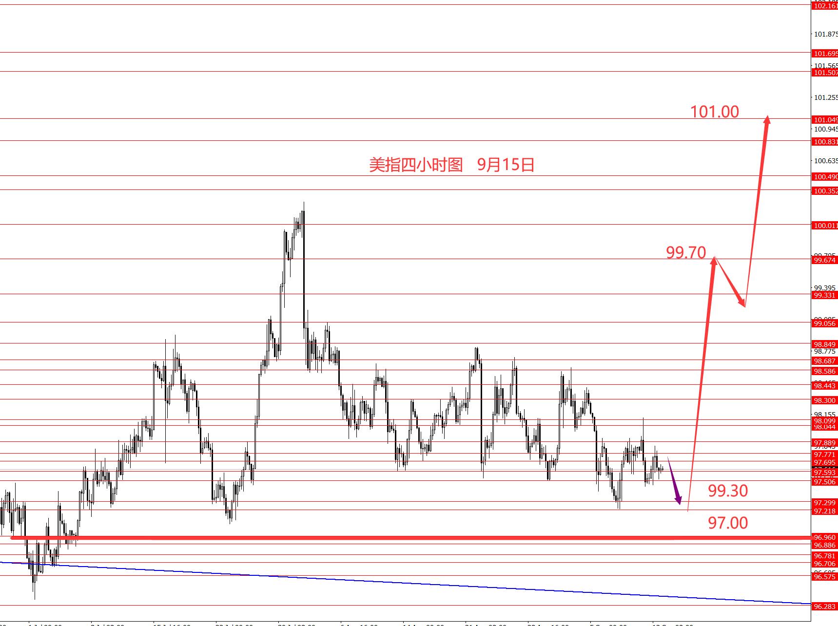 上周美指仍在低位震荡,周图收小阴柱。从图形来看,美指波段行情依然看涨,目标先看99.70和101.00区域。本周周凌晨有美国利率决议,数据过后,行情会相对明朗些。本周下方重点关注97.00区域强支撑,以上偏向于中线看涨,中线波段目标99.70和101和103.20区域。成功跌破97.00后则再重新分析框架。今日短线关注周五高点97.85,以下日内短线看空,目标97.30附近。重大数据前,建议短线操作,波段方向选择上,还是建议逢低做多较好。框架思路仅供参考风险自负。