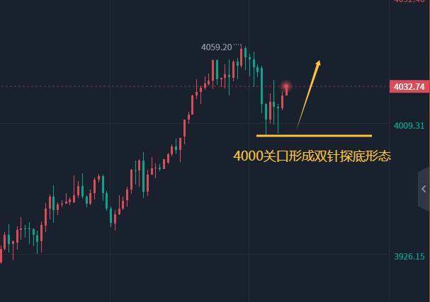 落实到具体盘面上来讲,下方支撑4000关口及3985区域,今日早盘黄金两度回撤至4000关口止步,1小时呈现双底形态,接下来就守住4000双底支撑看涨,以下破4000为损布局多。