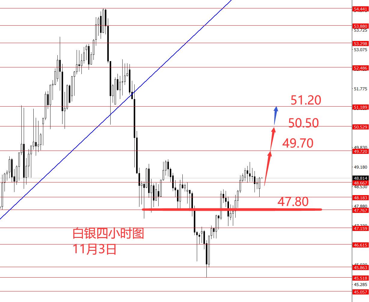 白银上周也正如预期先跌后反弹,只是波段转折点比预期的46.60低了一个档,最低45.50附近,所以本周也继续抓上周白银没走完的反弹行情,上方关注50.50和51.20。本周操作建议:48.20附近做多,止损47.50,目标看向49.70和50.50,极限再关注51.20附近。控制仓量,严格止损。