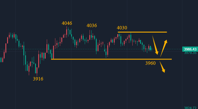 昨日强调黄金围绕3960防守去看冲高,关注4036及4046压制位置,冲高之后依托压制位置去放空黄金,思路是非常明确的,黄金现在整体就是来回震荡,不断拉扯,没有有效突破之前就是围绕区间高抛低吸,注意不要轻易来回追就行了。