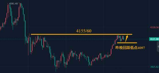 昨日价格冲高4150附近回落,这就相当于已经提前对续跌位置4155/60区域做出了测试,这是前期的关键开跌阻力,在前期下跌过程中曾多次对反弹行情形成压制,所以首次冲击不破展开回调在预期之中,昨晚回踩最低触及4097一线,稍微跌破4100之后快速反抽,说明黄金短线4100支撑依然有效,那么今日继续关注4100整数关口支撑,等回撤靠近之后去多而不追多,黄金现在依然在为突破4155/60蓄势,当然围绕这里之下短空可能也有机会,但我们不会去参与逆势博回调的机会。