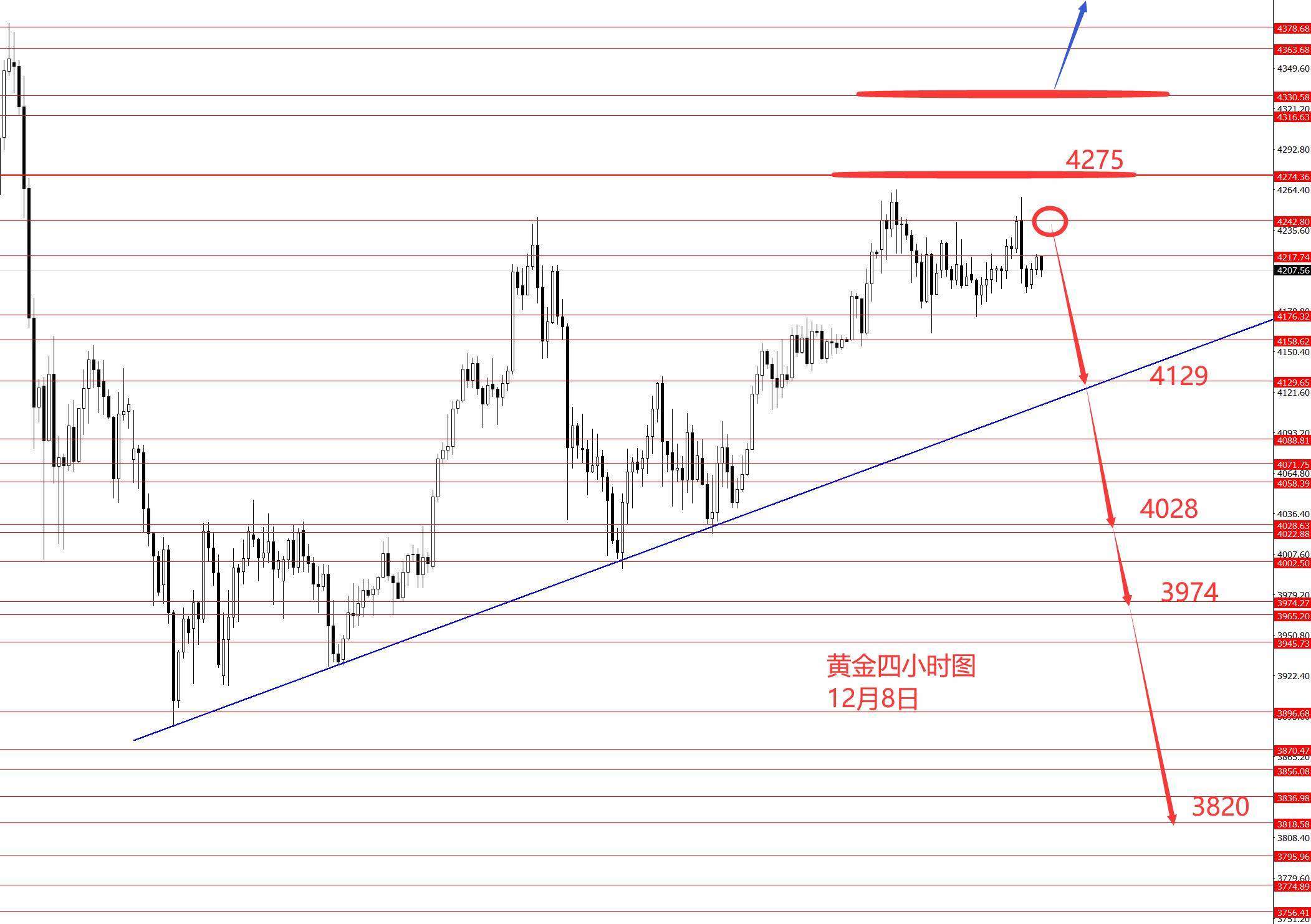 黄金上周最高到达4264附近后承压回落,一直在高位震荡。从图形来看,能在4275下方止步上涨,也算是附合大周期框架的,所以上周的红线框架本周延用,4275以下高空黄金,中线波段性看空,4275-4330区间看图形灵活处理,若成功站稳到4330上方再改多头,目标新高4530附近。本周抓上周大概率的红线行情,4275以看看空至3820.本周操作建议:4240附近做空,止损4272,目标看向4129和4030,再看向3974和3820.控制仓量,严格止损。