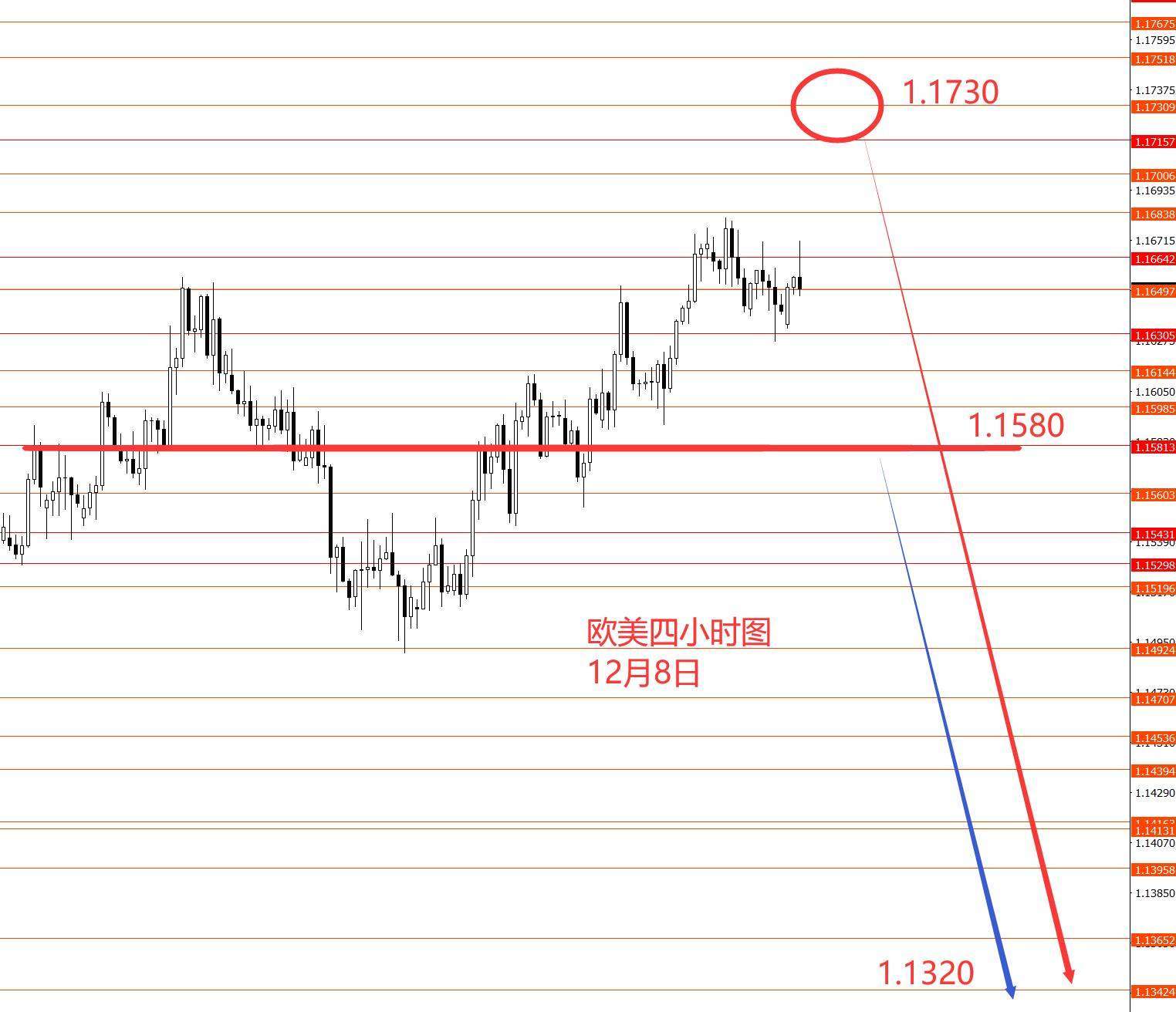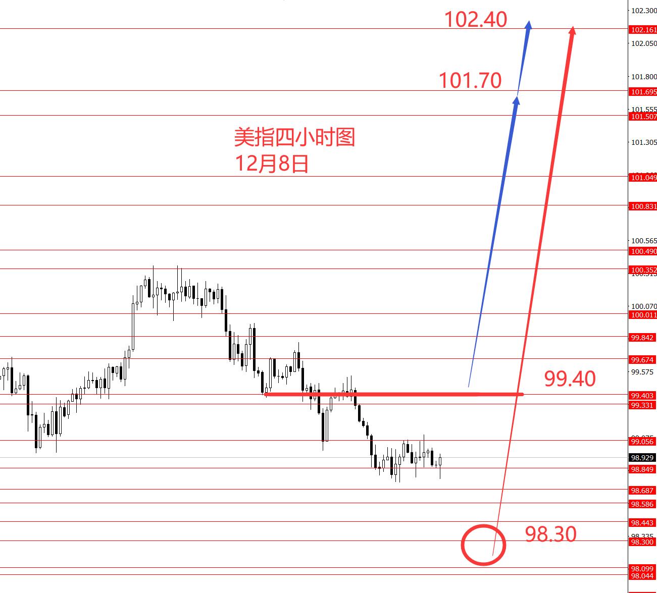 上周美指下破了99.00区域强支撑,周线收盘也偏空,所以本周继续关注上周蓝线走势,后市中线美指仍然看涨,中线向上行情并走完结。从图形来看,短线99.10以下还是偏空头,至于最低价能在哪里转势拉涨,还要看图形的进一步演化,下方重点关注98.00强支撑,以上中线继续看涨,而周初短线关注99.40强阻力,以下有可能继续震荡反复,关注99.40-98.00区间震荡行情。若直接涨至99.40上方,后市中线继续上行的概率加大,继续抓至101.70和102.40的中线波段向上行情。今日只有大概框架思路,没有具体操作策略。