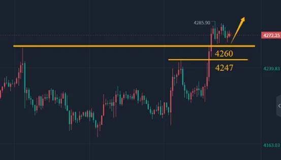 黄金多头节节攀升,最高触及至4285区域承压回落,那么关注今日回落力度,回落是给继续上车多头的机会,首要支撑在4260关口,其次就是4247支撑,日内亚欧盘回落不破4247,那么按照强势继续做多看涨,再看4285,破位4300。操作参考黄金4263多,防护4250,目标4300-4320。