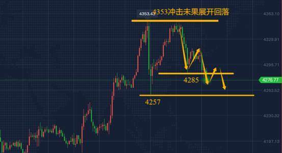 我说了,黄金回调做多但不追涨,尤其是面临上周五的高点4353压制位置,这里是本周关键的枢纽点,能否破位至关重要,持续探高不破高,多头能量消耗,势必会有再次展开调整的风险,所以强调短多靠近4350关口就要及时收割,冲高关键价位不破可以尝试小损去博空,严格破高认输出局即可。