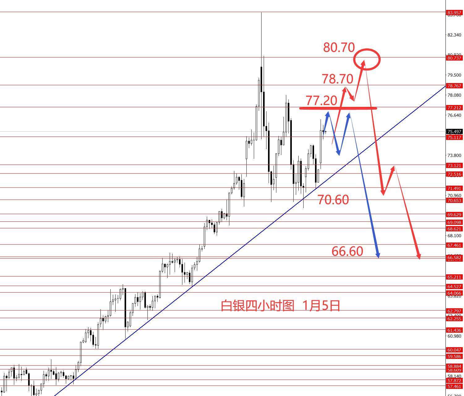白银上周停止上涨向下回调,波幅较大,周图收阴柱。从图形来看,白银短期见顶,近期后市建议按高位震荡或震荡下行操作,但下行空间有限,不能看的太远。本周目前还在单边趋势线上方运行,呈高位区间震荡格局,今日短线看涨,关注上方77.20至78.70区域强阻力,再上方80.70强阻力也值得关注,日内看涨,但周内看震荡,所以涨不动时,可在强阻力给出向下信号后做空。目前不确定能冲到哪里,走一步看一步吧,在这个框架下灵活处理吧,下方强支撑关注70.60和66.60.