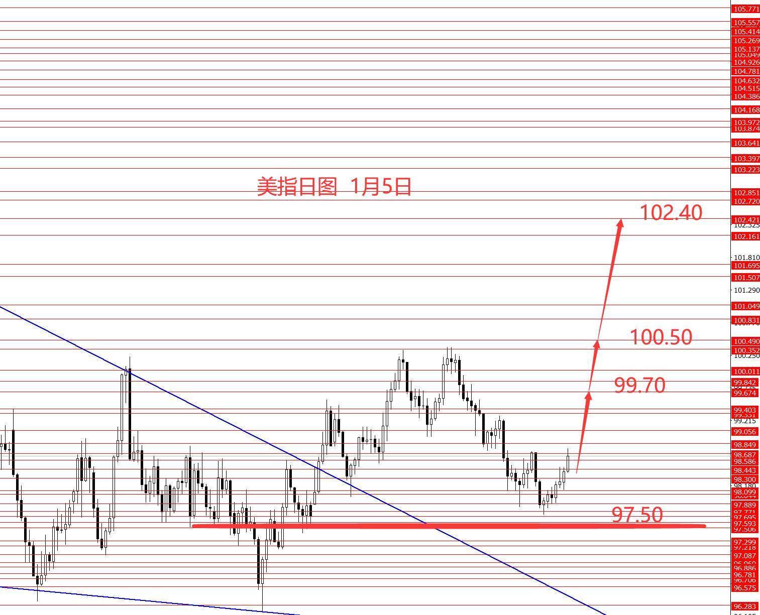 美指上周正如预期在97.50上方企稳上行,周图收阳柱。从图形来看,美指中线仍然看涨,本周关注下方98.10,以上继续看涨,日内关注下方98.40,以上继续看涨美指,中线看涨,也是长线中继修整行情。上周若持有多单,可继续持有。本周操作建议:98.40/50区域做多,止损98.10,目标看向99.70和100.50和102.40区域,控制仓量严格止损。